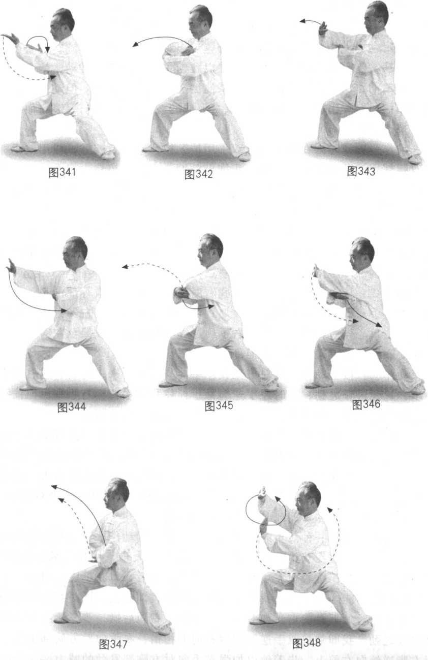 动作三:以腰为主宰结合丹田带动身快速略向左转开合折叠螺旋下沉, 重心偏右前。同时左腿略顺缠外转,膝里扣,脚掌踏实;右腿逆缠里转,脚 掌踏实。同时左手在前顺缠里勾腕由鼻尖前向右前上略上翻转,突出腕背, 掌心向里略偏下,指尖向里偏上,高与眼同;右手在左肘下逆缠里转向前上 搠出,臂半圆,后翻腕,掌心向右前偏上,指尖向左后,位在左手里上方。 眼看前兼顾左右,耳听身后。图(347、348)