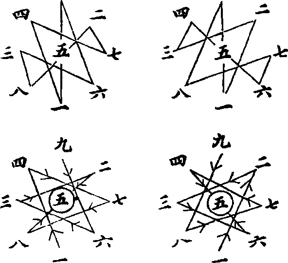上右图一二三、四五六、七八九,挨次连三方者, 天地体数顺行也。上左图一四七、二五八、三六九,隔 次连三方者,甲子用数逆行也。拳家缠丝精法所走之路, 适与相仿。右仰手与左俯手相向,若抱右手在下,从一 向二、向三、向六行;头领两足从九向八、向七、向四 行;四六同向,五扭缥,猛力一抖,气结中宫;左仰手 在下,从一向四、向七、向八行,头领两足从九向六、 向三、向二行;二八同向,五扭缥,猛力一抖,气结中 宫;左右扭缥,落点时,头、手、足皆成一、二、三, 或一、四、七矩折三角形。若兼带俯仰伸缩法,规矩方 为完全合一。久练纯熟,则起落进退,旋转自由,而轻
