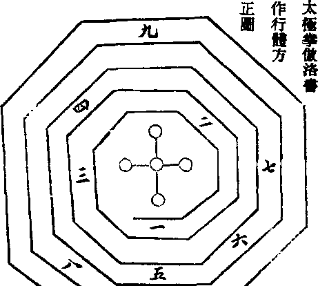 4444《河图》实为缠丝精之祖。单开如一字。两头合住, 周围撑开,则为太极圆图;错之,则为缠丝图;双之, 则为褊图;再双之,四角撑开,则为方图;至三角、五 角、六角、七角、八角、九角,皆方图也,皆由一生二 而推之也。即《尧典》所载日月运行、错综之缠次圆图, 莫非由一字所生也?兹不俱论。此图专主缠丝劲说。因 拳中股肱宜用,故推及之。