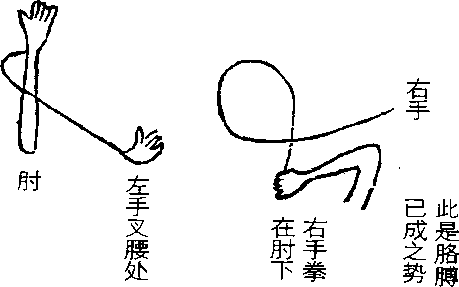 右手在东起端处左肘在下, 肘沉下,肩 压住 此右手倒转一圈手涉到上右手在东起端处左肘在下, 肘沉下,肩 压住 此右手倒转一圈手涉到上--E; 右手由东向下再 右手在芽上行‘顺转一圈 落在肘下--E; 右手由东向下再 右手在芽上行‘顺转一圈 落在肘下