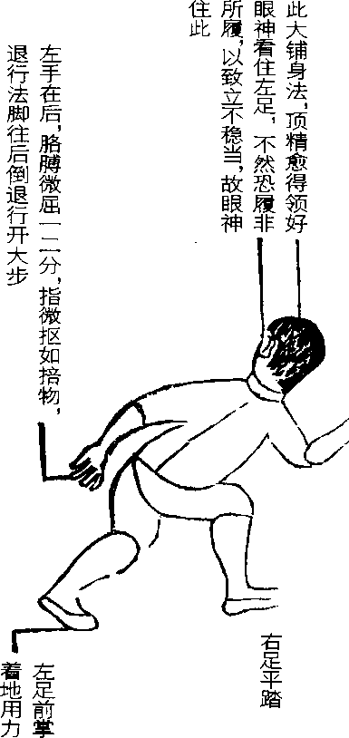 圈身法。足法皆是随手法倒缠,退行之形。左手在后, 由后到前,则右手到后;右手由后倒转到前(前即面前, 其位在上),则左手即倒转到后(后谓身后,其位在下)。左 手到上,右手到下,右手转回到上,左手即转到下。手 以足之退行为的,左足退行一步,约有三尺许,左手亦 倒转一圈,左足在后,左手亦在后,迨至右足退行在后, 左手与左足皆在前矣。右足退行到后,右手也是随住右 足倒转一圈到后。右足右手在后,则左手左足到前;左 手左足到前,则右手右足到后。左右手一替一回,互为 前后,更迭运行,圈圆如车轮运转,但车轮一齐向前运, 此则两手更迭往后行。