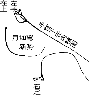 又展白鹅右翅开,虚擎两 手护怀来,沉肘压肩蛾眉肖, 一点灵机在心裁(左右手往北 上,不可直率,其意如蛾眉之弯, 又如初三初四之月。右足绕半圈 向右开步,左足随之应敌。能预 定其理,不能预定其势,故在临 时随机应变,宜引在,引在自己 斟酌)。