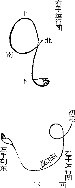 前右脚在西,此则左脚从右脚前倒转步,过右脚二 尺余,落在西方亦不停留。一势未成,如何能暂停?阅 者莫误内精。前势腰弯下时,中气从背下二十一节起逆 行而上,过头顶前涉下至丹田,此执中气由丹田发起, 逆行过胸到头顶,越脑降下,复至下,二十一节接住, 仍逆行,上过头顶降下去,仍归到丹田。此督脉逆行接 住任脉,下去转回;任脉逆行接住督脉,逆行到头顶降 下,仍归到二十一节,复自下逆行,上过头顶降下,归 到丹田。前势督脉逆行,任脉顺行,只转一圈;此势任 脉逆行,接督脉过顶,顺下至二十一节即转回。督脉复 逆行,上过顶涉下,接住任脉,顺降下归丹田,是任先 督后,转一圈,复督先任后,又转一圈,是中截一势, 而脉督来回转两圈也。