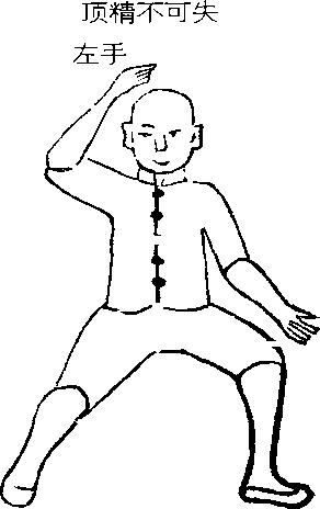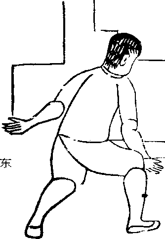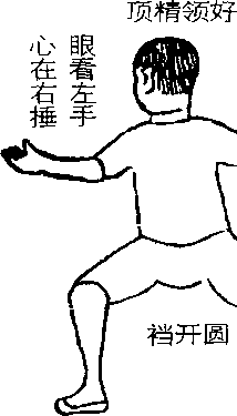 右足方向西开步,右手即向南而北转一圈 侧板住手向裆中涉下去,顶精领好中气通 脊骨下二十一节