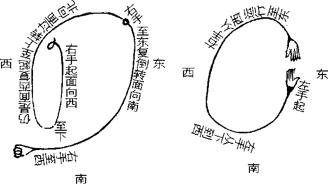 左手随右手亦绕一圈,左足退行开步到 后(东方),左手从上涉下复自下涉上到 背后,此是半势图非停留势