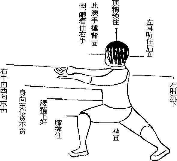 忽然有敌自东来,石拳即向东面开,右足进步休宽 缓,乘兴来者仰面回。