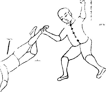此图吾以左脚踢敌,敌以右手捋住吾脚,欲扭转吾 脚,令吾疼痛仆地,或上提吾脚,欲吾全身离地,而后 颠起打之。吾即顺势倒转,两手捺住地,而以右足顺住 左腿,逆行而上,蹉敌人搦吾左脚之右手,难即解矣。 或又以敌人搦吾左脚,吾即以右脚蹬敌人右肘尖,或蹬 其手节,皆可解之。此是蹬一跟之大略。至于临时形势 不同,不妨以吾之得势,蹬其要害处以解之,临时致用, 是在审机者因便应敌。