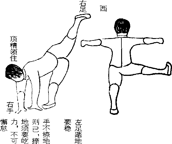 再将右足上蹬天,顺住左腿蹉无偏。事到难时皆有 法,谁知身体解倒悬。