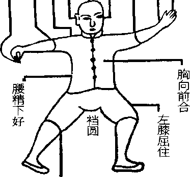 指肚用力怦住指肚」. 两手把(去声)无软I 肘弯微屈似新月形I 眼看住黑 顶嘱起来 耳听住后面 两肩松下 两肘弯露霍— 右手五需依,撮住无伸开