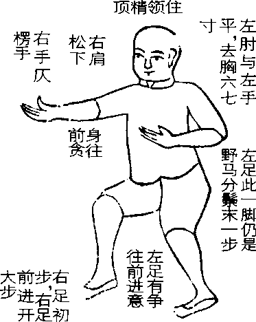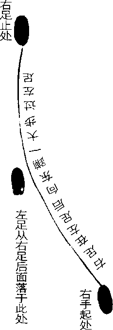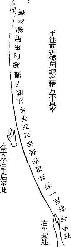 此势与第一单鞭相为呼应。如文之纪律法度,不可 散涣。身法、手法、步法、内外缠丝精法,皆与第一单 鞭同,独其起势与之异。第一起势,是从第一揽擦衣来, 身法如彼。此单鞭,是从野马分鬃来。必待野马分鬃左 手左足在前,刚才落住,尚未停稳。而以右足向东跃 (即俗谓往前搭前步)一大步,先以右足落住脚,然后左足 向西开步拉单鞭。当右足而向东跃时,右手即从下斜插 上去,绕一大圈向东°其内精用顺缠法,自下而里、而 上、而外,至下斜缠至腋,此是与第一单鞭承上不同处, 其余官骸运行,大同小异。