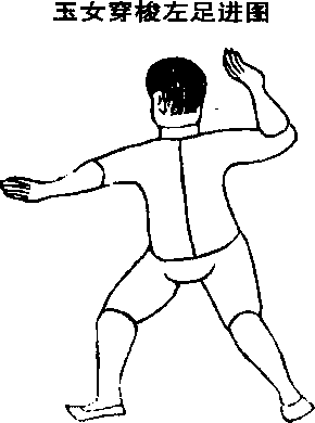 此玉女穿梭第二步(左 足)进步姿势。面已转过向 南,身已转过一半矣。此不 算成势,是中间运行之形, 亦是方转不停,莫误看。左 足进步,足趾向东者,亦随 右足趾向西,切莫停留。手 法、步法、转法,愈快愈好。