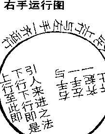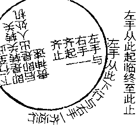 问运手其端由何而起? 日:由左手指头领起。运由何先?目:由右手指头肚与 小指掌。由何处为运转机关,由何处为运行之始?曰: 左手既领动右手,则右手之与右肱平者,由上设下,顺 转至右膝外,上行过心口,运至鼻,越右额角,过右肩 上,复运至起初运动原位,才够一圈。右肘沉下,右肩 压下,右脚随右手也是顺转。右手至膝外,右脚随右手 收至左足边。是时右手上行往外运,右脚亦是上行往右 运。但右足落脚,比原位稍近里边五六寸,是谓开步于 无意之中。当右手至右膝外,将上行之际,则左手自上 下行也,是顺转法。右手上行,向右运行至原位,则左 手下行至膝矣,左足亦收至右足边。待右手下行至膝外, 则左手与右手一齐运。左手也是上行,至心口复上运至 鼻准,越左额角,过肩上,运至左手起初原位。左足从 右足外向左开步,亦是顺转法。但右足于右少运五六寸, 则左足方能于左多开五六寸。左手至原位,则左右运转 各自一周。左右一周之后,机不停留。右手从下复上行, 左手从上行,终而复始,更迭运行,循环不已,如日月 之代明。