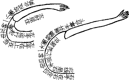 何谓摆脚?右脚抬起,与右腿根平,横而向北,以 足婢人(婢,击也)。然必右肱向右伸开,左肱屈住,手 向右,两手掌朝屋 左右手横而向南打右足。右足横而 向北(即右方),迎左右手至中间,如两人对敌。左右手 摩荡右足,右足摩荡左右手。手足对头,毕错过去右手。 左手平而向左,左肱伸开,右手亦平而向左肱。屈住右 足,与肱平向,右膝稍屈住,停而不停,将有下落之机,