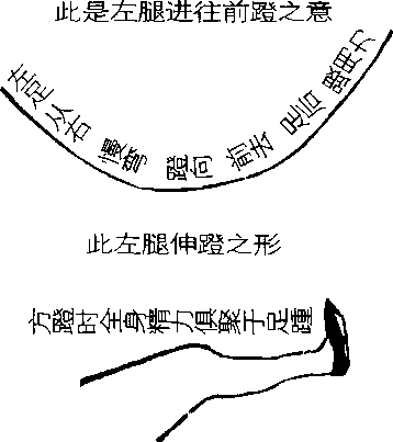 用弓背朝下,精如初月上弯形,左手与左足自上而 下,至下向前蹬。复自下而上,自上而下者,跌岔之始 事也。自下而上者,跌岔之终事也。非此无以叫起下势 之起势。