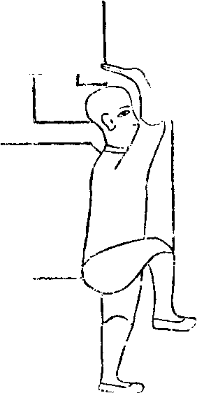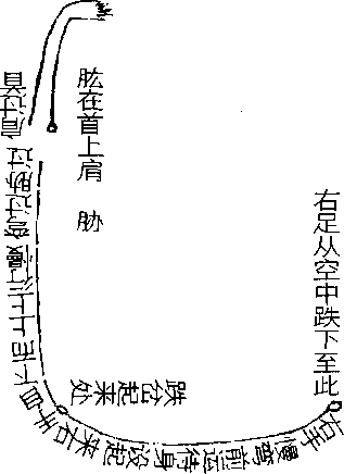 自跌岔后,心精往 上一提,左足大趾与足 踵用力前合,右膝往上 一起,右足趾与右足踵 往前合,两腿执硬,两 手往前攒,顶精与裆精 往上一领,手足随之一 齐俱用力,自然起来。 将起来时,身往前纵、 右足踵往后蹬。身既离 地,左手慢弯,上行至