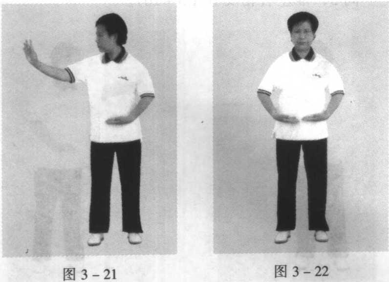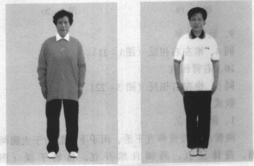身体重心慢慢移至右腿,左脚提起向右腿并拢, 成并脚自然站立。目前平视(图3-24)。图 3 - 23 图 3 - 24【要点】1. 动作1?5为左横掌练习;6?10为右横掌练 习。左右练习可交替反复进行,一般按四八拍练习为 宜。2. 以身带臂,上肢动作要圆活连贯。3. 精神和劲力要贯彻始终,不要松懈,呼吸要 自然。