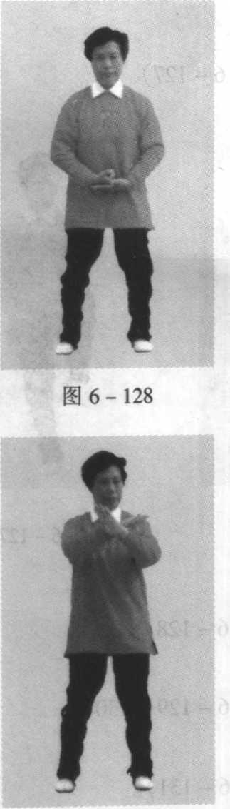 同1,惟左右相反(图6-127)。图 6-126图 6-1279. 踏脚砸拳同2,惟左右相反10. 转体翻掌同3,惟左右相反11. 屈膝分掌同4,惟左右相反12. 擦步合臂同5,惟左右相反(图 6-128)o(图 6-129、130) o(图 6-131)。(图 6-132)。13. 马步翻掌同6,惟左右相反(图6-133)。图 6-130图 6-131图 6-13214. 马步立掌同7,惟左右相反,此为揽扎衣右式(图6-134) o图 6-134