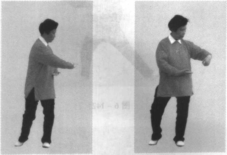 上体微右转,右掌外旋,掌心翻向上,内收于腹 前,小指侧轻贴腹部;左掌变勾经右掌上方向左上出 勾,同腰高,勾尖朝左后方,目视左手。这时呼气 (图6-141)。