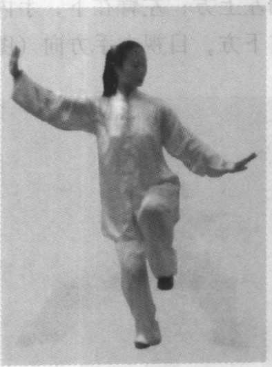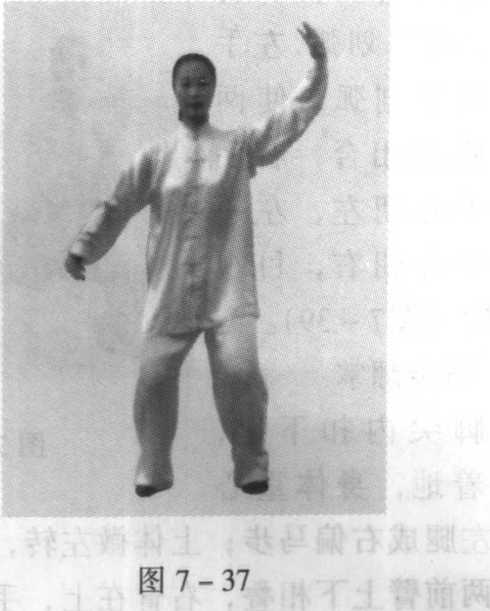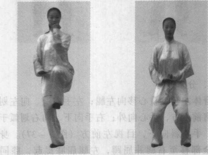 身体左转,重心移向左腿;左手向上、向左划弧 于左肩前上方,手心向外;右手向下、向右划弧于右 胯旁,手心斜向下,目视左前方(图7-37)。身体 重心全部移至右腿并屈蹲,左腿屈膝提起,膝同腹 高,脚尖翘起;左手向左、向下划孤下落于胯左前