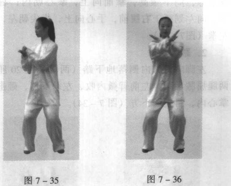 身体重心移向左腿,上体左转;左拳变掌,两前 臂内旋,两掌外翻,掌心向外,两腕相搭于胸前,右 手在外,目视右手(图7-36)o
