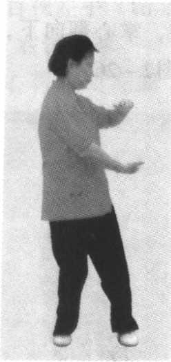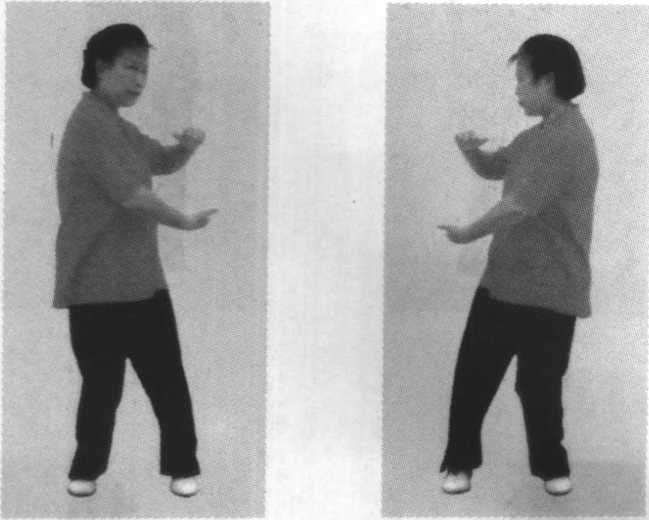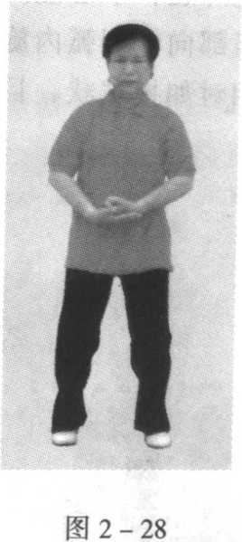 重心稍左移至两脚之间,上体微右转,面向正前 方,左拳变拳落于右掌上,成“太极桩”势(图 2-28)o