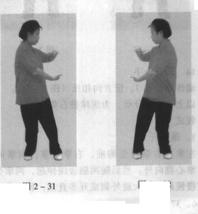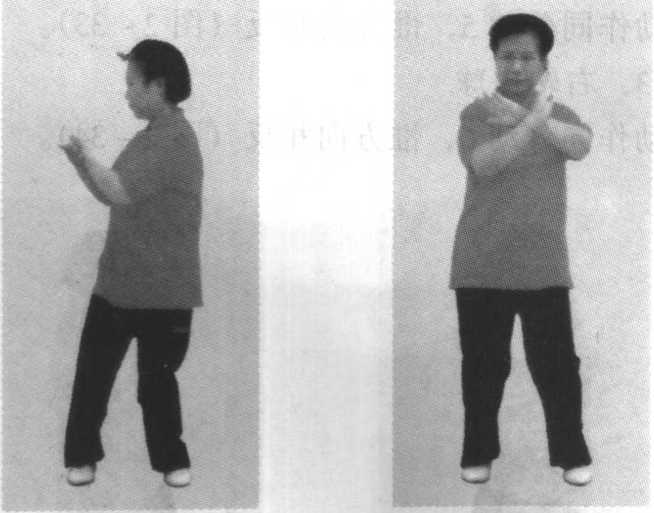 重心左移,上体微左转;左拳变掌,两前臂内 旋,两掌外翻,掌心均向外,两腕相搭于胸前,左腕 在里,目视右掌(图2-30)o