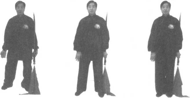 口令2:右脚向左脚内侧上步,两腿并立;同时左手握刀盘向左向上向下弧形环绕,贴靠左大 腿外侧。与此同时,右臂内旋,手掌向右向上向下弧形环绕贴靠右腿向下压掌,掌心朝下,目视前 方。(04-60)