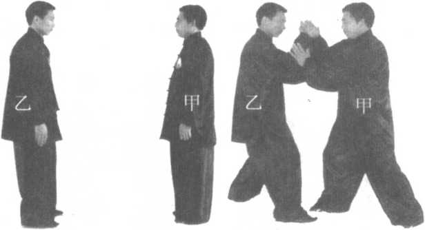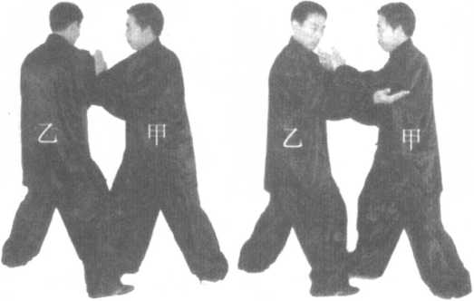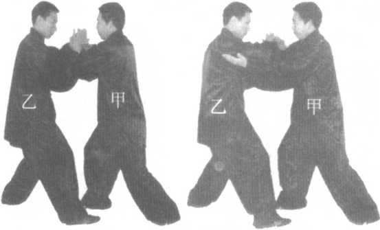 如果双方搭手后乙方先领劲,则甲方捋,乙方挤;甲方按,乙方搠捋;甲方挤,乙方按;甲方左 手搠于乙方右臂下。(图5-19至22)