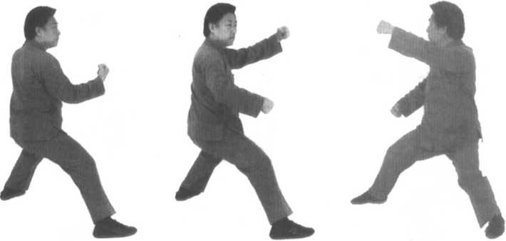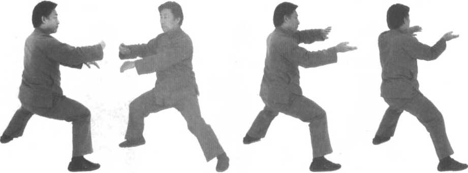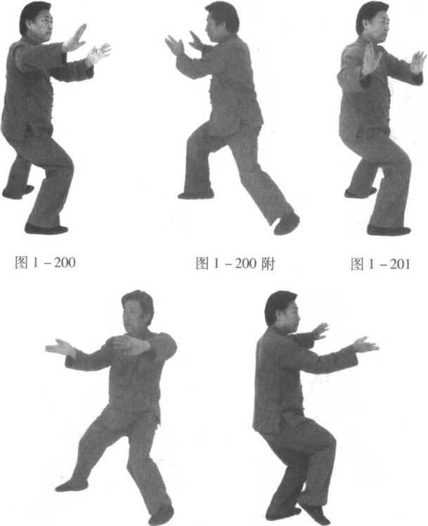 口令4(图1 -206、207、208) 重心右移,左拳内旋收于左前方,右拳向下向外内旋置于右