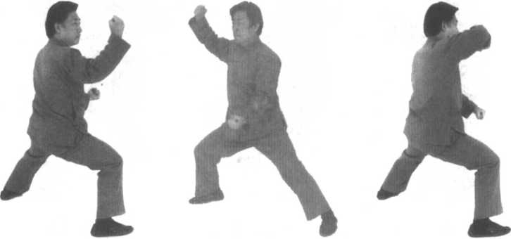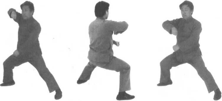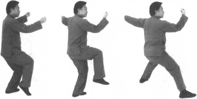 要点:此势要求里外缠丝,节节贯串,周身一致。裆口要圆而低,两腿虚实变换要分清,才易感知会阴之气上冲尾闾。右 拳上举,左拳外旋向下时,注意左肩放松下沉,成扩胸的动作。