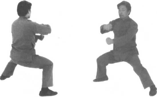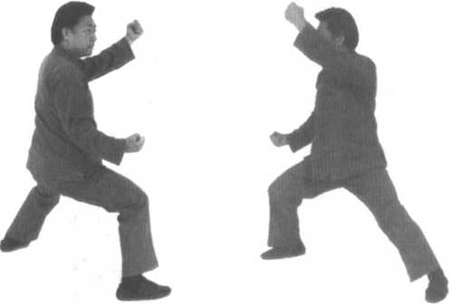 拳于左侧上方略高于肩,右拳于右胸前,拳心向里。