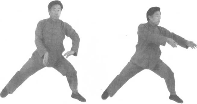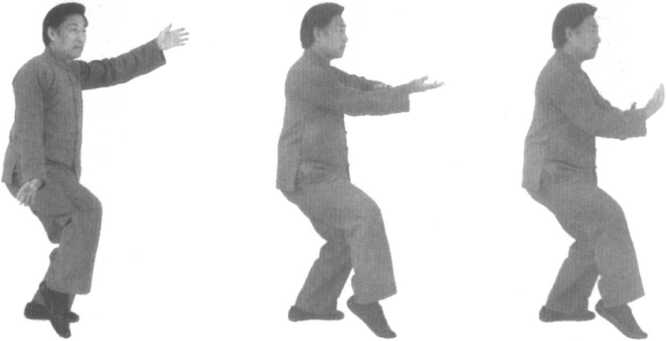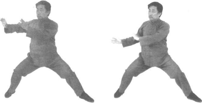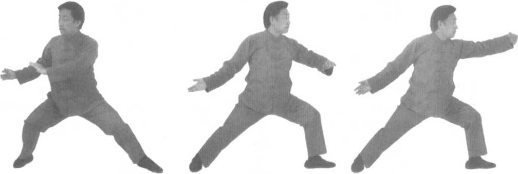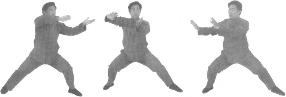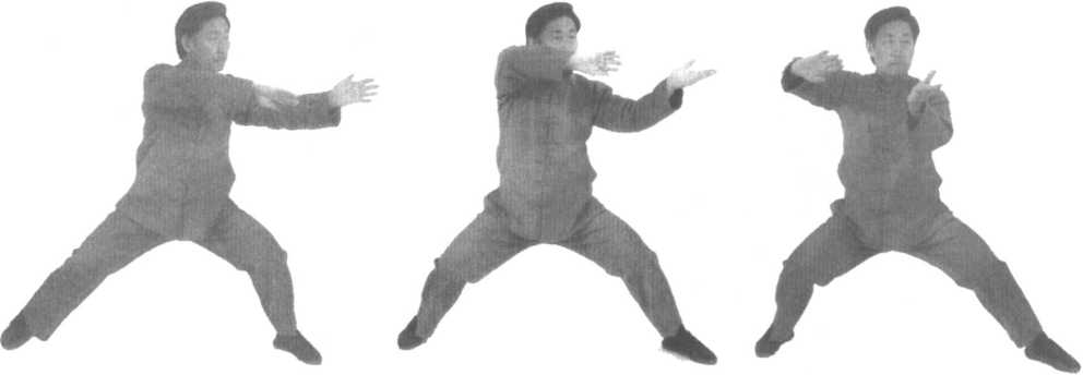 口令5(图2 -72、73、74) 身体先微右转后左转,重心左移,同时双手内旋,左手至左前