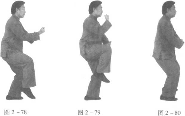 右膝抬起与腹平,脚尖向下,同时左掌心向上于腹前,右手握拳,屈肘