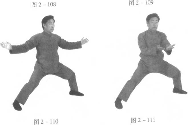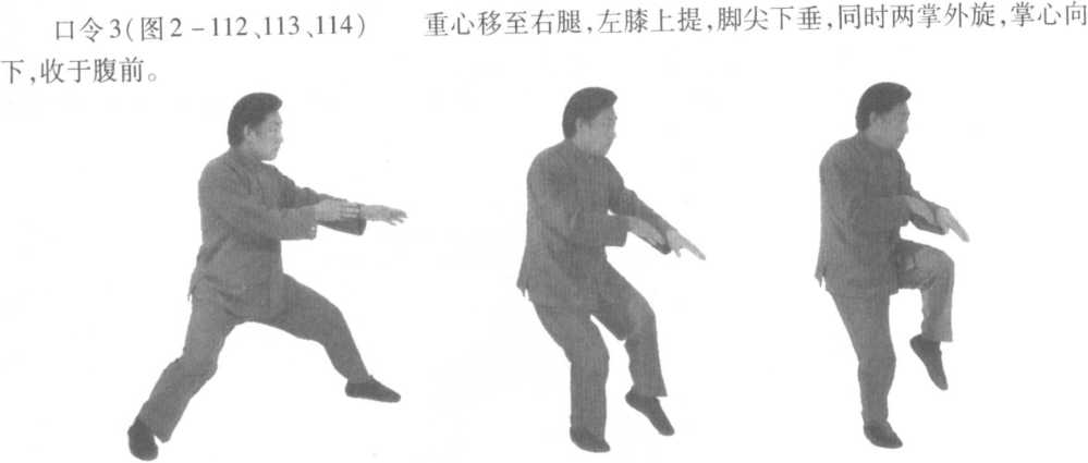 口令2(图2 -109、110、111) 两掌外分向下划弧合至左膝上方,掌心向上。
