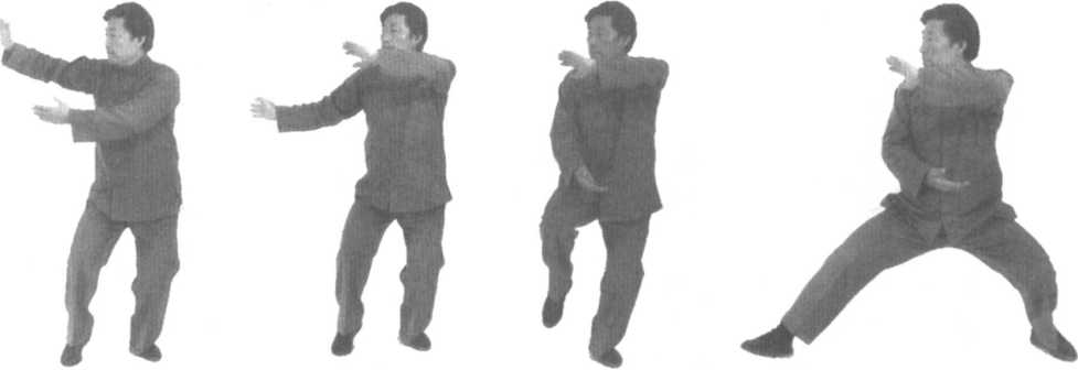 身体右转,右脚尖外摆,同时左手内旋,右手外旋,左下右上划 重心移至右腿,身体右转180度,提左脚向左侧横开一大步,同时左