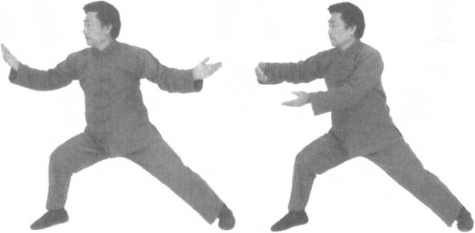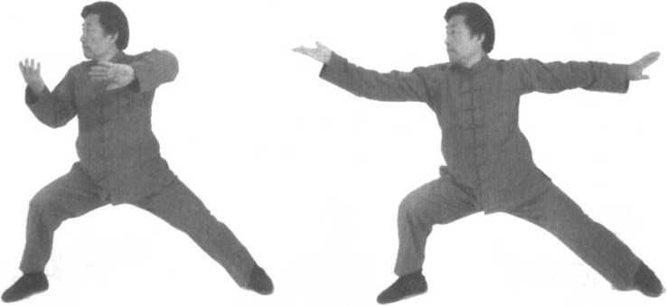 口令2 (图2-581、582) 身体稍右转,重心移至右腿,同时两臂向两侧外分,与肩同高,
