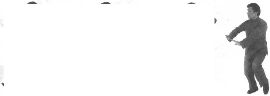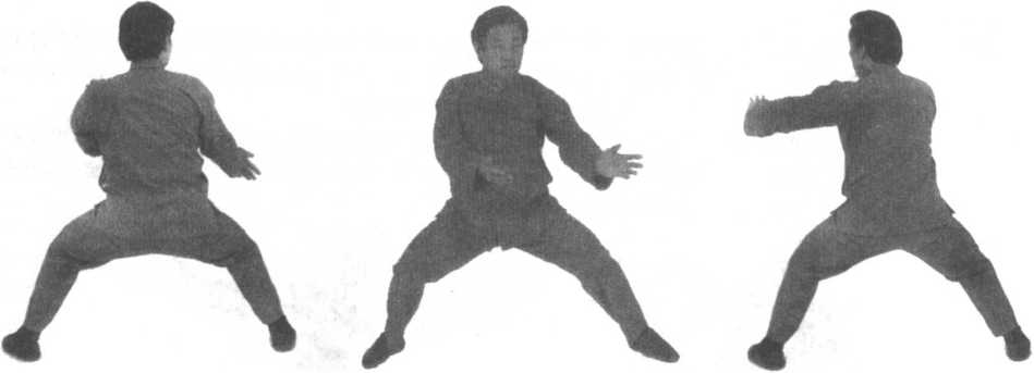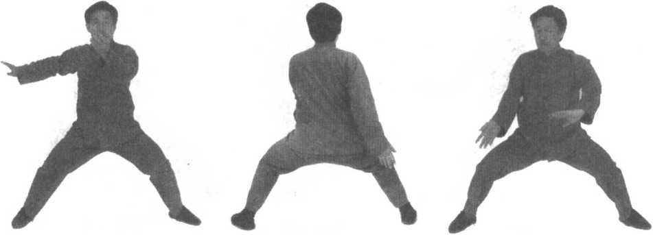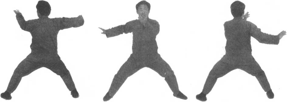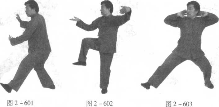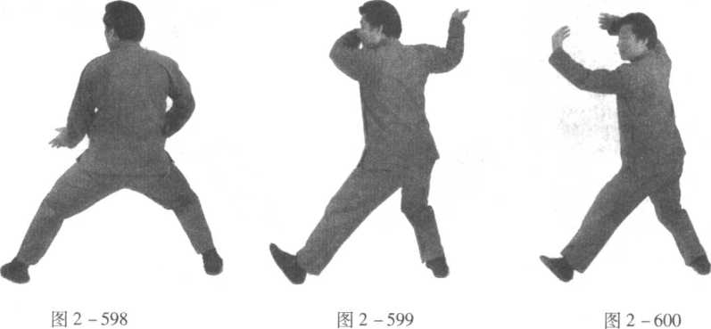口令3 (图2 -598、599、600) 身体右转,重心右移,左脚尖外摆,同时双手向下运至身体