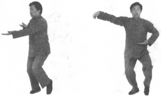 身体左转90度,重心移至左腿,右脚提起,同时双手向上划弧