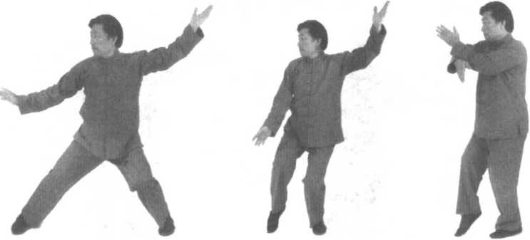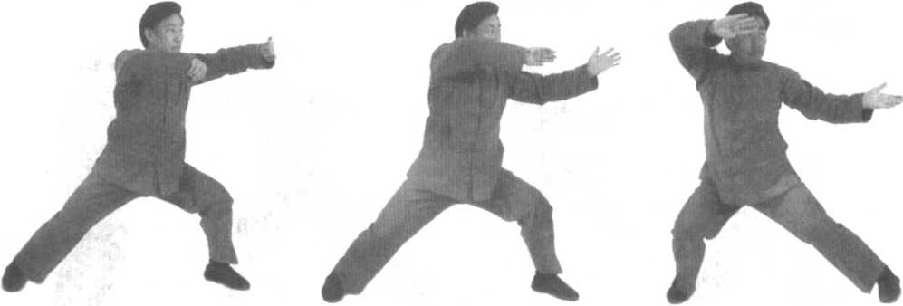 2.此势好像一种特殊的三级跳远,是在三跃步中用旋转身体来完成的;在技击上说,它适用于穿出包围圈,是在亦 攻亦守的姿势下穿出来的。