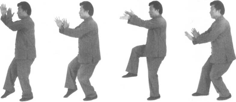 随身起落而上提下按(面向西)。