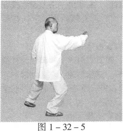动作五:身体稍左转沉,胸向北,眼看右肘外。左脚顺缠外摆 转踏实,重心移左前;右脚逆缠里踞转。双腕粘连,双掌逆缠向胸 前掘,左掌在里,掌心向右前,右掌在外,掌心向左前。再双掌 顺缠向前上探,左掌在上,右掌在下。(图1 -33-5)