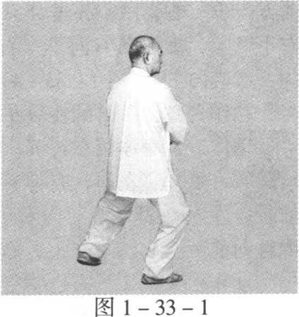 动作一:身体左转沉,胸向东北,眼看右前方。左脚顺缠外踞 转,开膝圆裆;右脚顺缠膝里合,重心偏右腿。左掌贴腹前顺缠 掘劲转,里上勾腕,掌心向上,指尖向上;右掌由右前上方顺缠 捋至腹前,后翻腕,掌心向左前下。(图1-33-1)