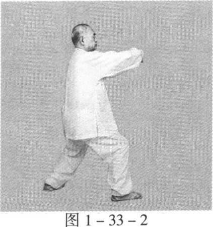 动作二:身体快速右转沉,胸向东,眼看双臂前。左脚逆缠里 踞转,重心偏左腿;右脚逆缠膝里扣。左掌由腹前逆缠贴右小臂里 侧向前上挤,掌心向里下;右掌逆缠掌背贴左小臂外侧向前上挤, 掌心向前,掌高与鼻同。(图1-33-2)