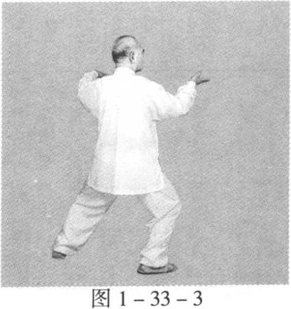 动作三:身体左转沉,胸向东北,眼看右前方。左脚顺缠外跟 转;右脚顺缠膝里合,重心偏右腿。左掌逆缠由前上划下弧向左前 上掘,掌高与鼻同,里勾腕,掌心向里下;右掌顺缠由前上划下 弧向右前上掘,掌高与肩平,掌心向上。(图1 - 33 - 3)
