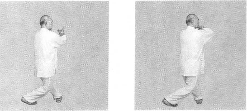 动作六:身体左转升,胸向北,眼看右前。左脚逆缠膝里扣,
