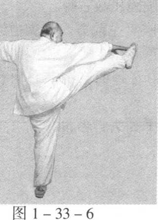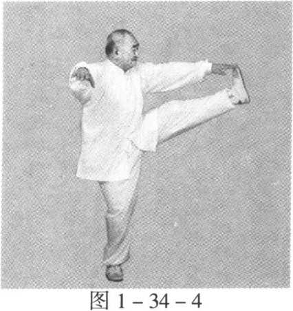 动作三:身体右转升,胸向南,眼看左前方。左脚逆缠里转, 左脚向左前上踢;右脚逆缠膝里扣,重心在右腿。双掌由前上逆缠 划上孤,向左前右后掘出,左掌迎拍左脚面。右掌心向右后下, 掌高与右肩平。(图1 - 34-4)