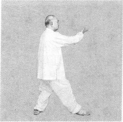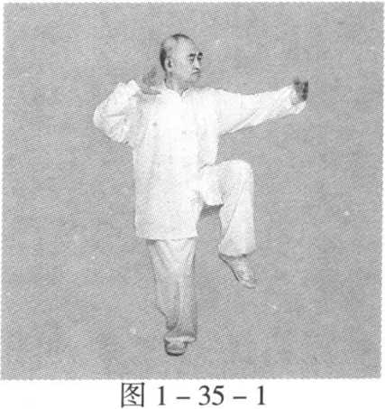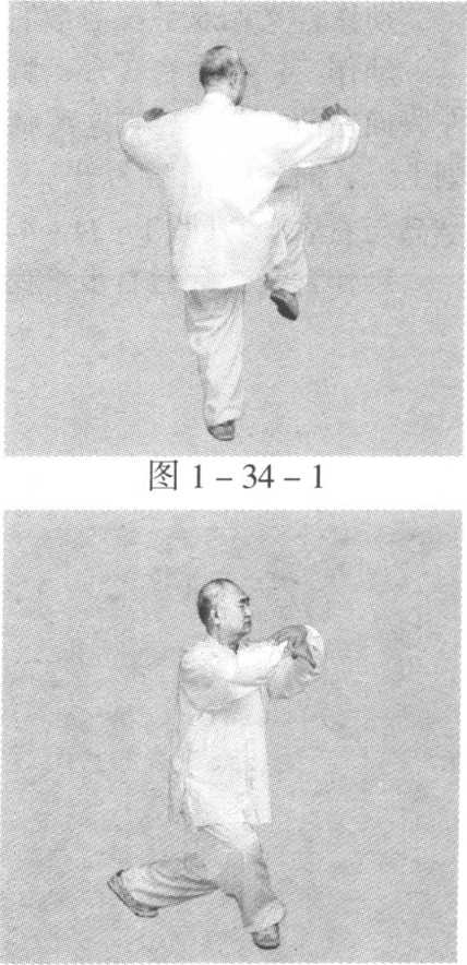 动作一:身体微左转升,胸向北,眼看前方。左脚逆缠膝里 扣,重心在左腿;右脚逆缠里转,膝上提。双掌在右前左后逆缠向 外掘。(图1 - 34 - 1)