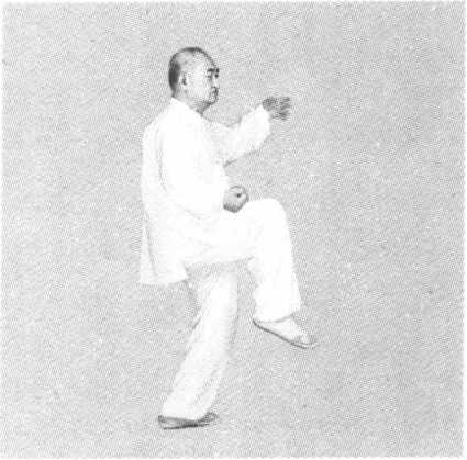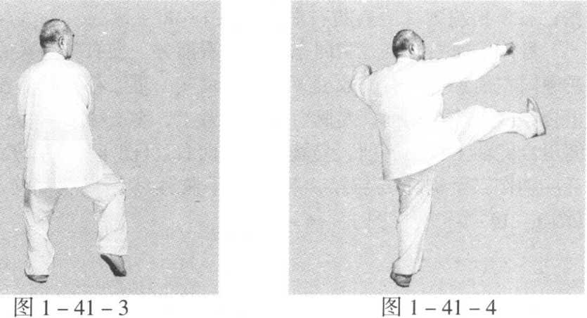 动作一:身体快速微左转升,胸向东,眼看左右。左脚逆缠膝 里扣,重心在左腿;右脚逆缠里转,膝上提。左拳变掌微顺缠微外 ffi;右拳稍顺缠探至右肋右前方(图1 -43-1)