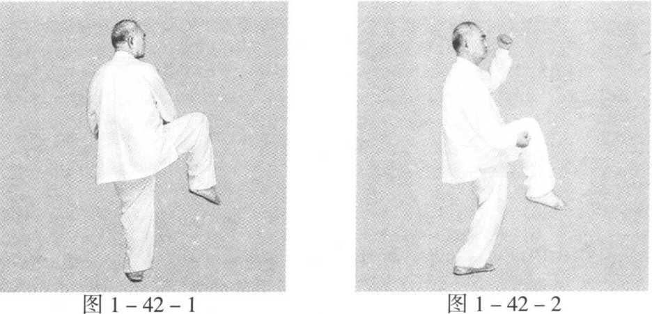 动作二:身体快速右转沉,胸向东,眼看右再看前方。左脚逆 缠里扣转踏实,重心在左腿;右脚顺缠外转,右膝里扣上提护裆, 右脚里合护左膝。左拳顺缠向左上屈肘探至左耳左侧,拳心向右 里偏下;右拳顺缠划上弧经鼻前屈肘按至腹右前,拳心向上。(图 1-42-2)