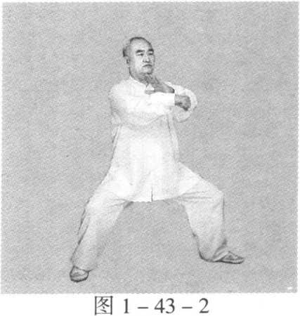 身体快速右转沉,胸向东南,眼看前方。当右脚踏实后,左脚 逆缠向左前铲步;右脚顺缠下沉震脚踏实,重心移右腿。左掌逆缠 里合经前上按至胸前,左腕合在右腕臂上,掌心向右前下;右拳逆 缠里合经前上按至胸前,勾腕,拳心向右。(图1 -43-2)